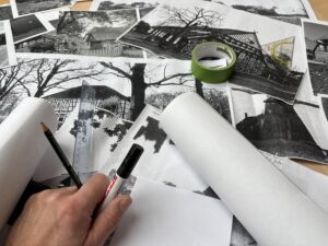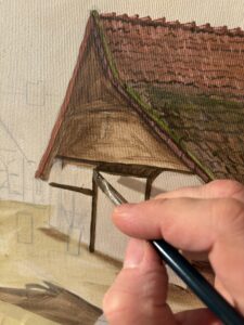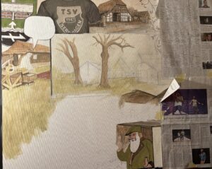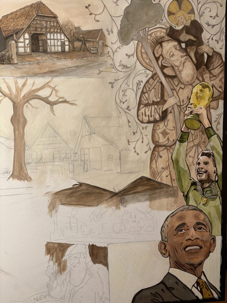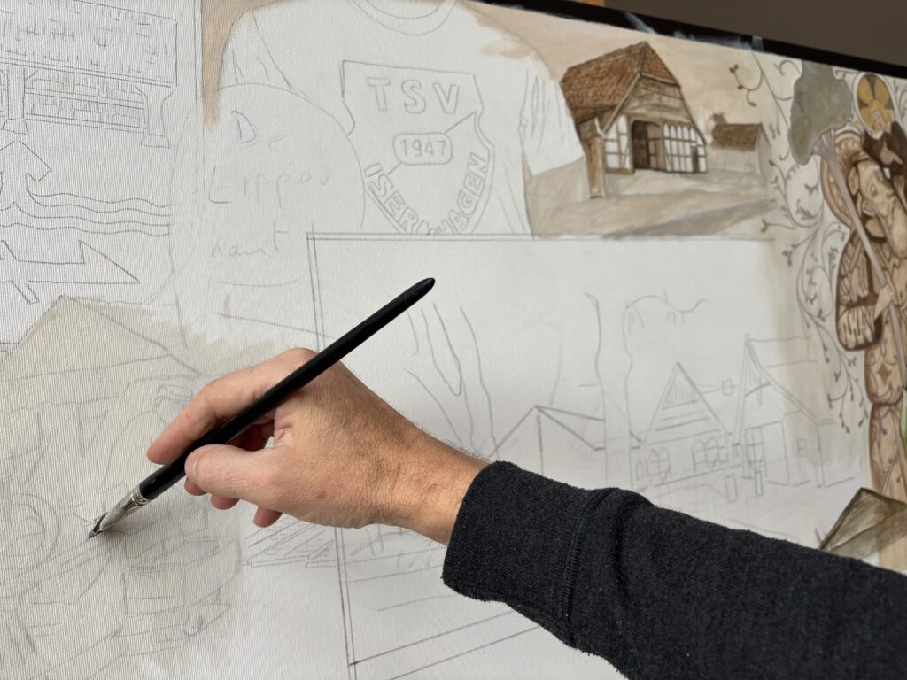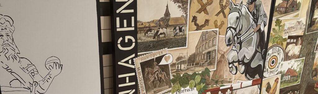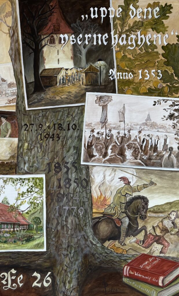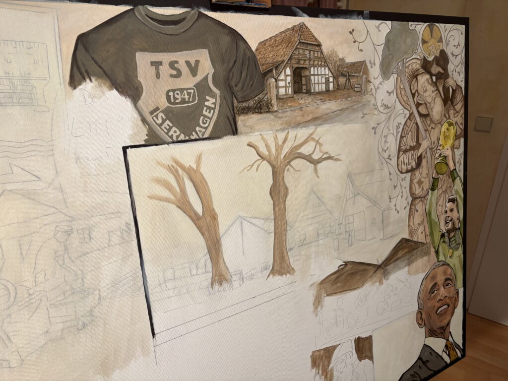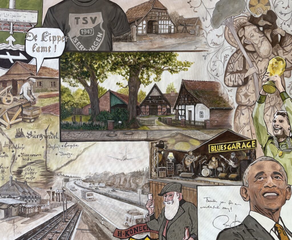 In den letzten 2 Jahren habe ich mich intensiv mit der Geschichte Isernhagens beschäftigt. Dabei ist ein 4m breites Bild, mit ca. 40 Motiven und Themen, über die letzten gut 1200 Jahre des Ortes entstanden. Es geht von Karl dem Großen bis Barack Obama, von den Hopfenfahrern bis zur Blues Garage, von den sumpfigen Ausläufern der Wietze bis zu den modernen Verkehrsmitteln unserer Zeit und es erzählt auch von einem verschwundenem Dorf. Diese Arbeit steht im Zentrum der Ausstellung.
